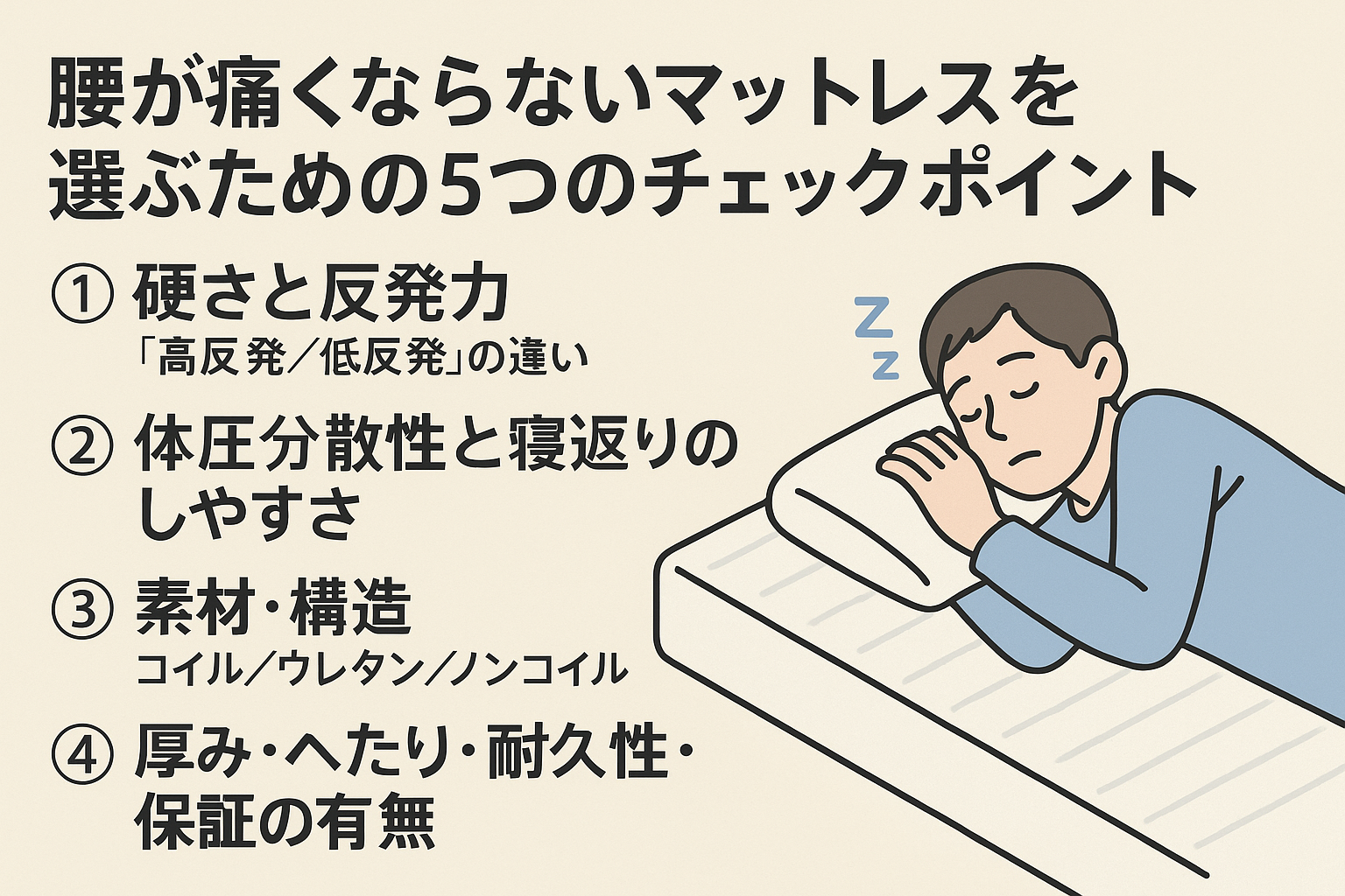#マットレス選び #腰痛対策の寝具 #反発力の目安 #ライフスタイル別寝具 #劣化チェックポイント