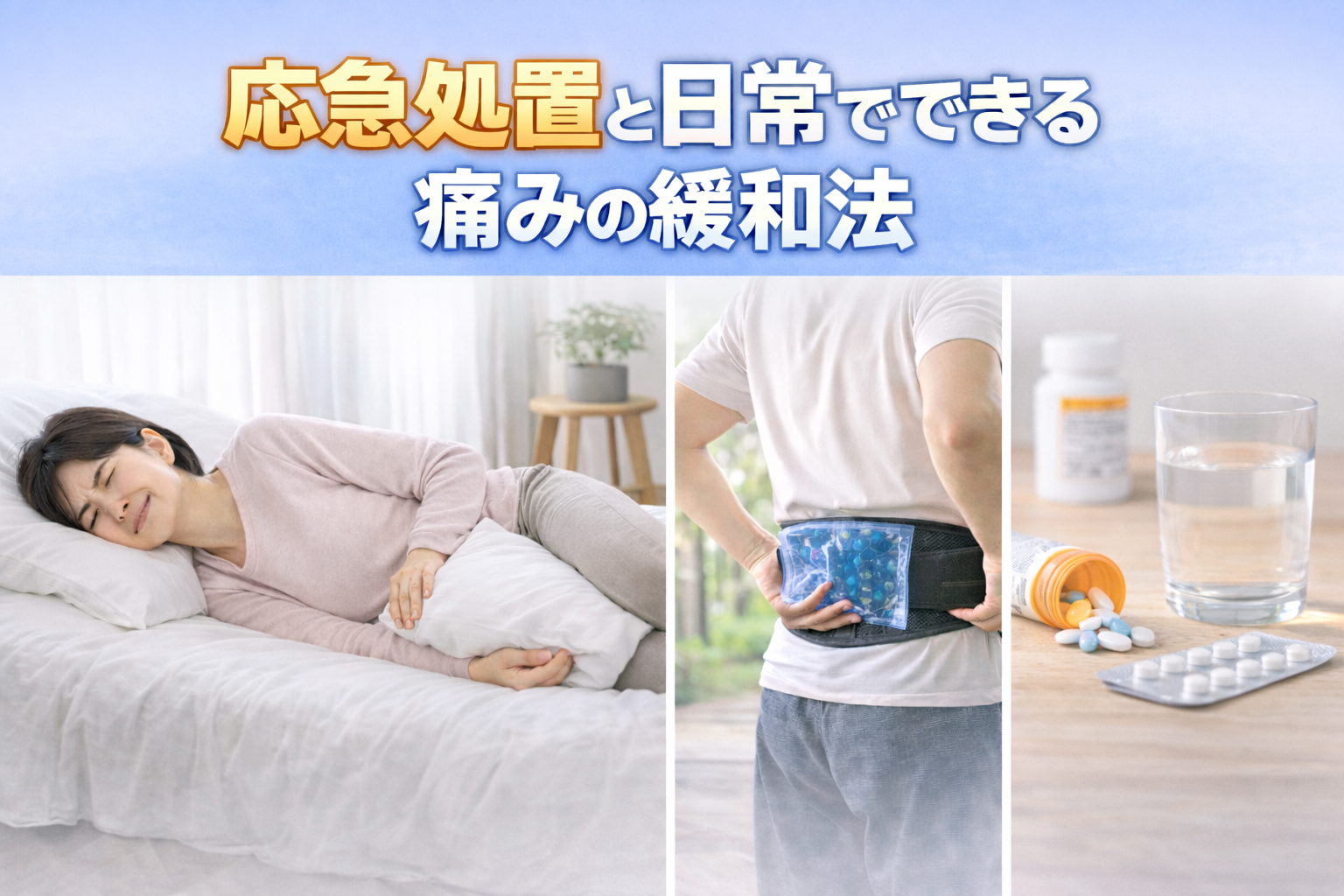 まず大切なのは、無理に動かそうとしないことだと言われています。焦って体を起こすより、楽な姿勢を探すほうが結果的に負担を減らせるそうです。上位の解説でも、初期対応がその後の経過に影響すると紹介されています。