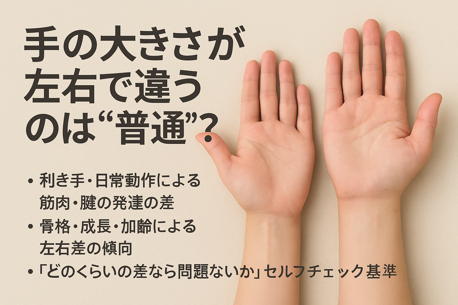 「手の大きさが左右で違うと病気なのかな…?」と心配になる人は意外と多いですが、まず知っておきたいのは“左右差そのものは珍しくない”という点です。実際、参考記事でも「利き手の使い方や筋肉量のちがいで手の厚みや見た目に差が出ることはよくあると言われています」(引用元:https://kumanomi-seikotu.com/blog/3980/)と紹介されています。