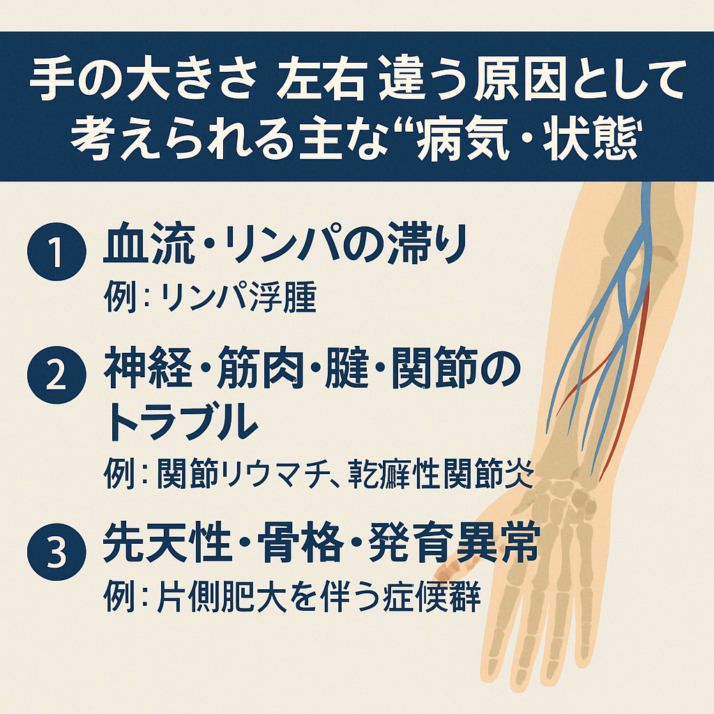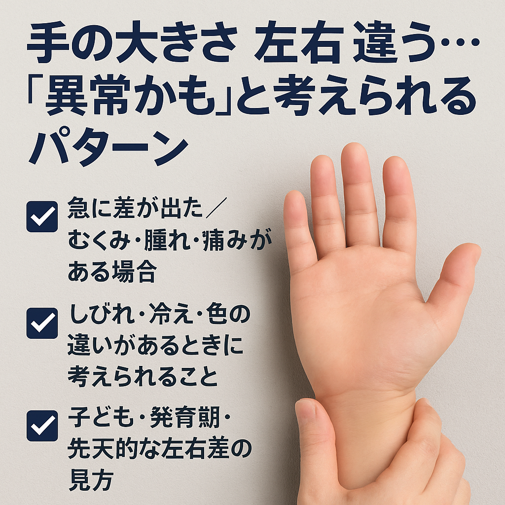 「手の大きさが左右で違う時って、どんなことが関係するんだろう?」と不安になることがありますよね。自然な左右差もありますが、参考記事では「血流・リンパ・関節の問題などが手の大きさに影響する場合があると言われています」(引用元:https://kumanomi-seikotu.com/blog/3980/)と紹介されています。ここでは、よく挙げられる代表的な原因を、会話のような流れで整理していきます。