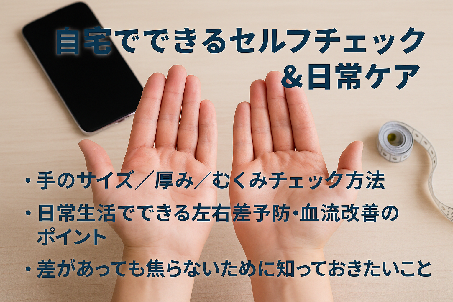 「手の大きさが左右で違う気がするけど、本当にそうなのかな?」と確かめたいとき、自宅でできるセルフチェックはかなり役に立つと言われています。参考記事でも「写真を使った比較や、むくみの確認がセルフチェックとして使われていると言われています」(引用元:https://kumanomi-seikotu.com/blog/3980/)と紹介されています。ここでは、実際に家でできる方法をやさしくまとめていきます。