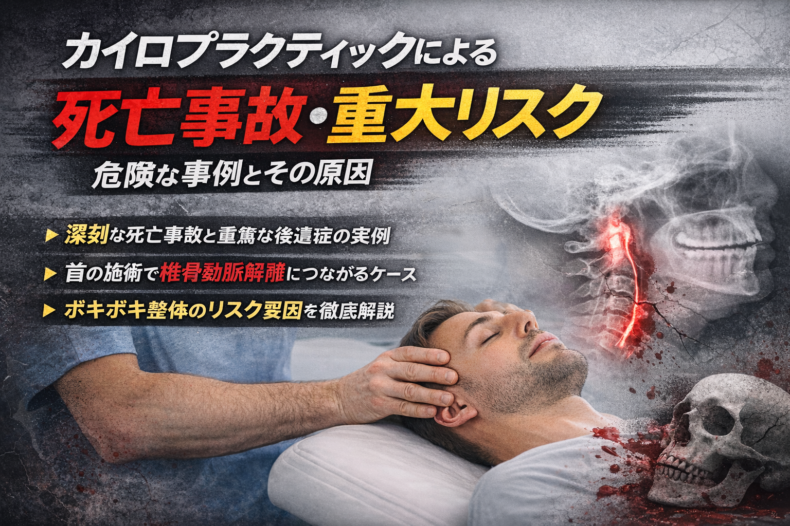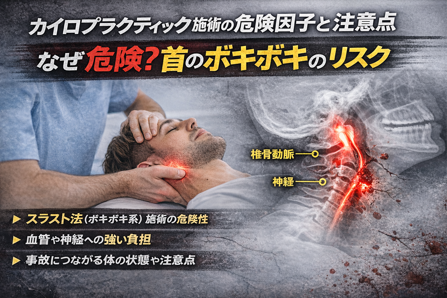 特に問題視されているのが、首の急激な回旋を伴う施術。中でも“ボキボキ系”と呼ばれる手法は、場合によっては血管や神経に強い負担をかける可能性があると言われています。