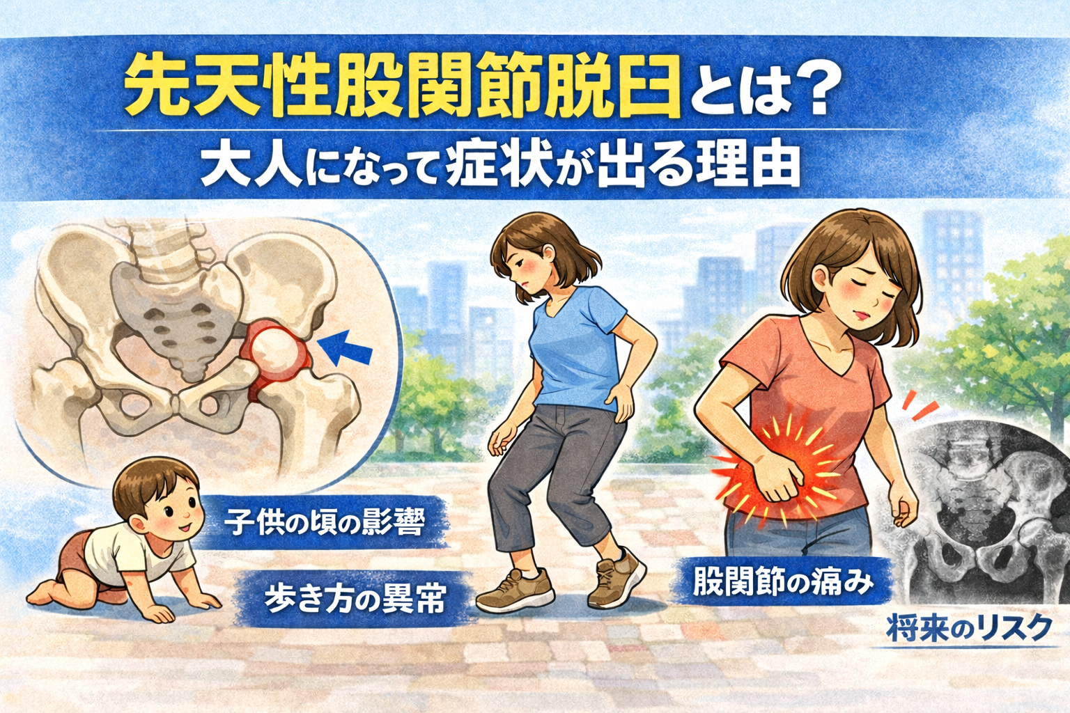 「昔は特に気にならなかったけれど、最近歩き方が気になる」「長く歩くと股関節が疲れやすい」そんな声も少なくありません。ここでは、先天性股関節脱臼の基本と、大人になってから症状が出る理由についてわかりやすく見ていきましょう。