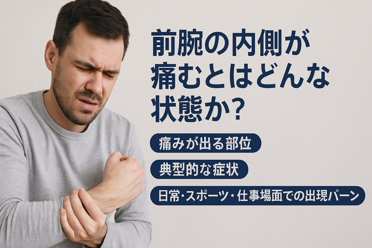 前腕の“内側”とは、肘の内側から手のひら側にかけてのラインを指すことが多く、ここには筋肉・腱・神経が集中しています。この部位の痛みは、長時間のパソコン作業や、スポーツでの反復動作によって起こりやすいと言われています(引用元:https://ar-ex.jp/special/630070821000/)。