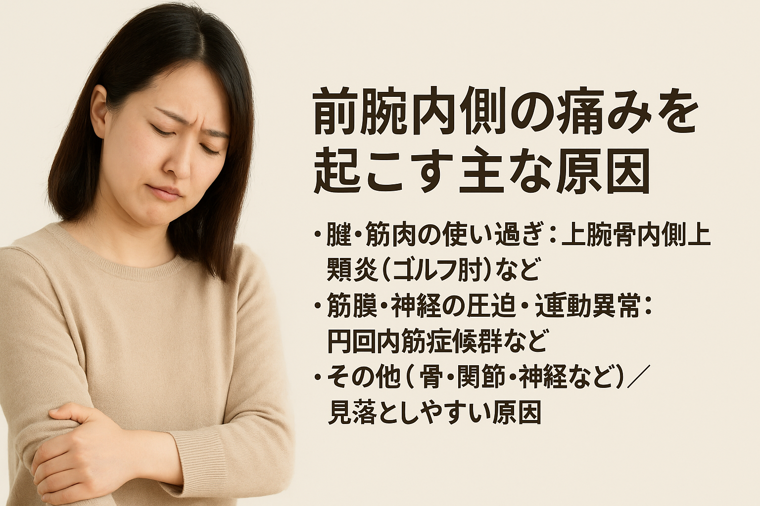つまり、「前腕の内側が痛むから“腱の炎症”だろう」と決めつけずに、複合的な視点で原因を探ることが重要です。
