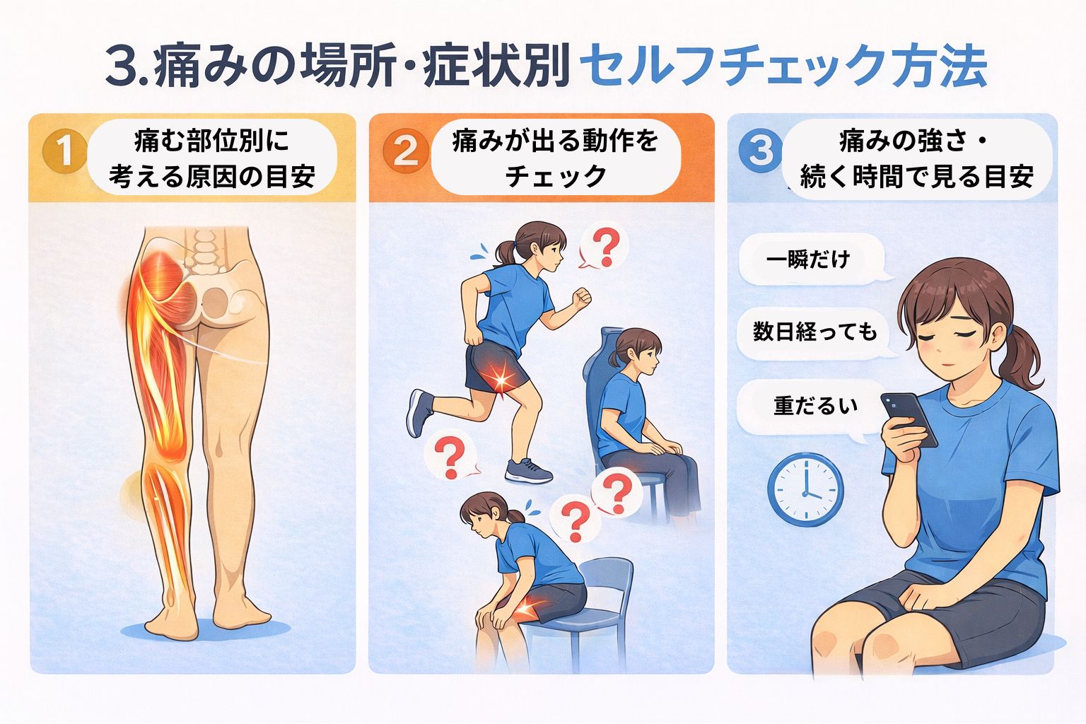 走るときだけ痛むのか、立ち上がる瞬間に違和感があるのか、前にかがんだときにつらいのか。こうした動作の違いによって、考えられる原因も変わると言われています。スポーツ中のみ出る痛みと、日常動作で出る痛みは、同じではない可能性があるようです。