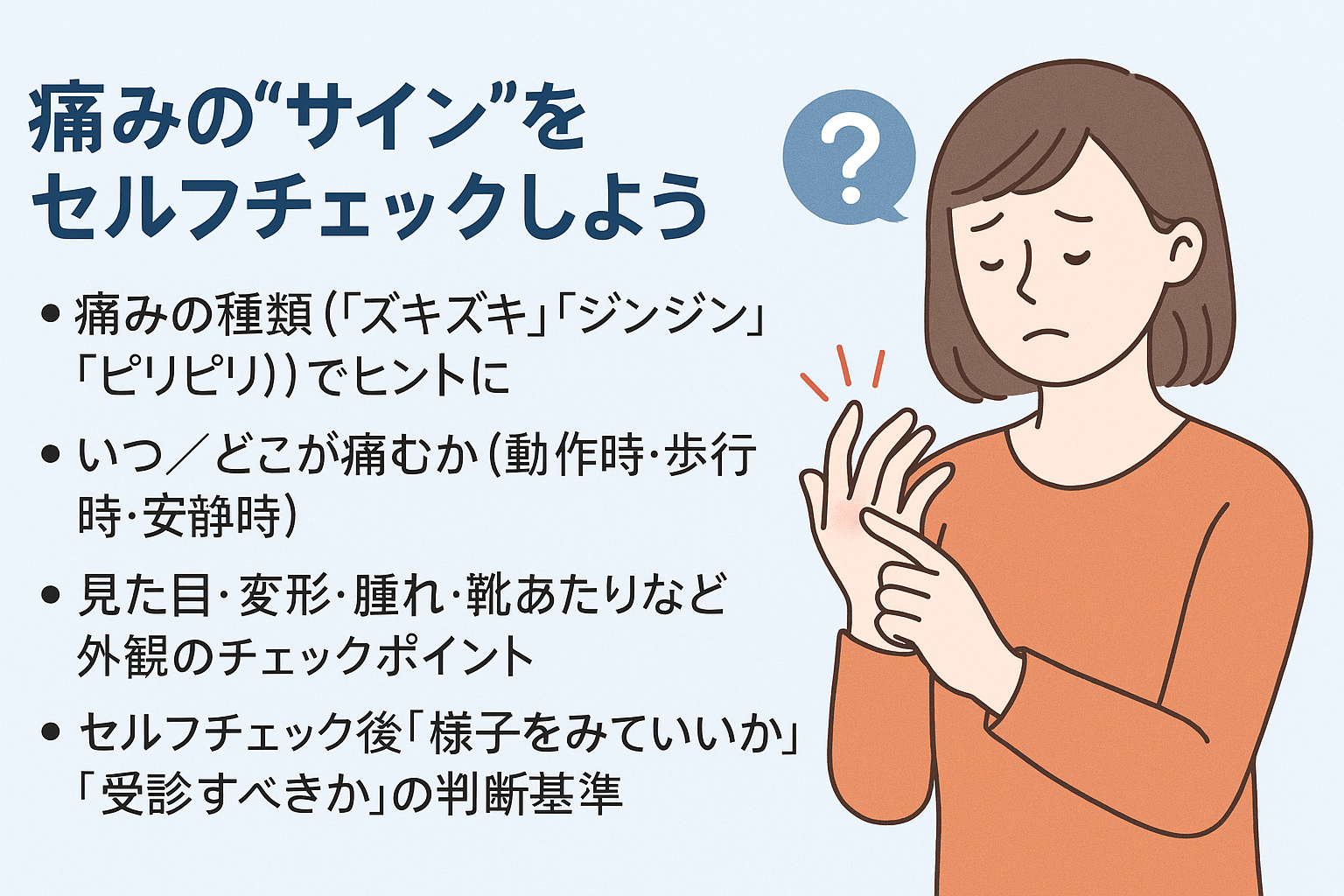 さらに、「いつ痛むのか」にも注目しましょう。歩行や作業中に痛む場合は動作負荷、夜間や朝に強くなる痛みは慢性炎症の傾向があるとされています(引用元:maniwa-seikei.com)。