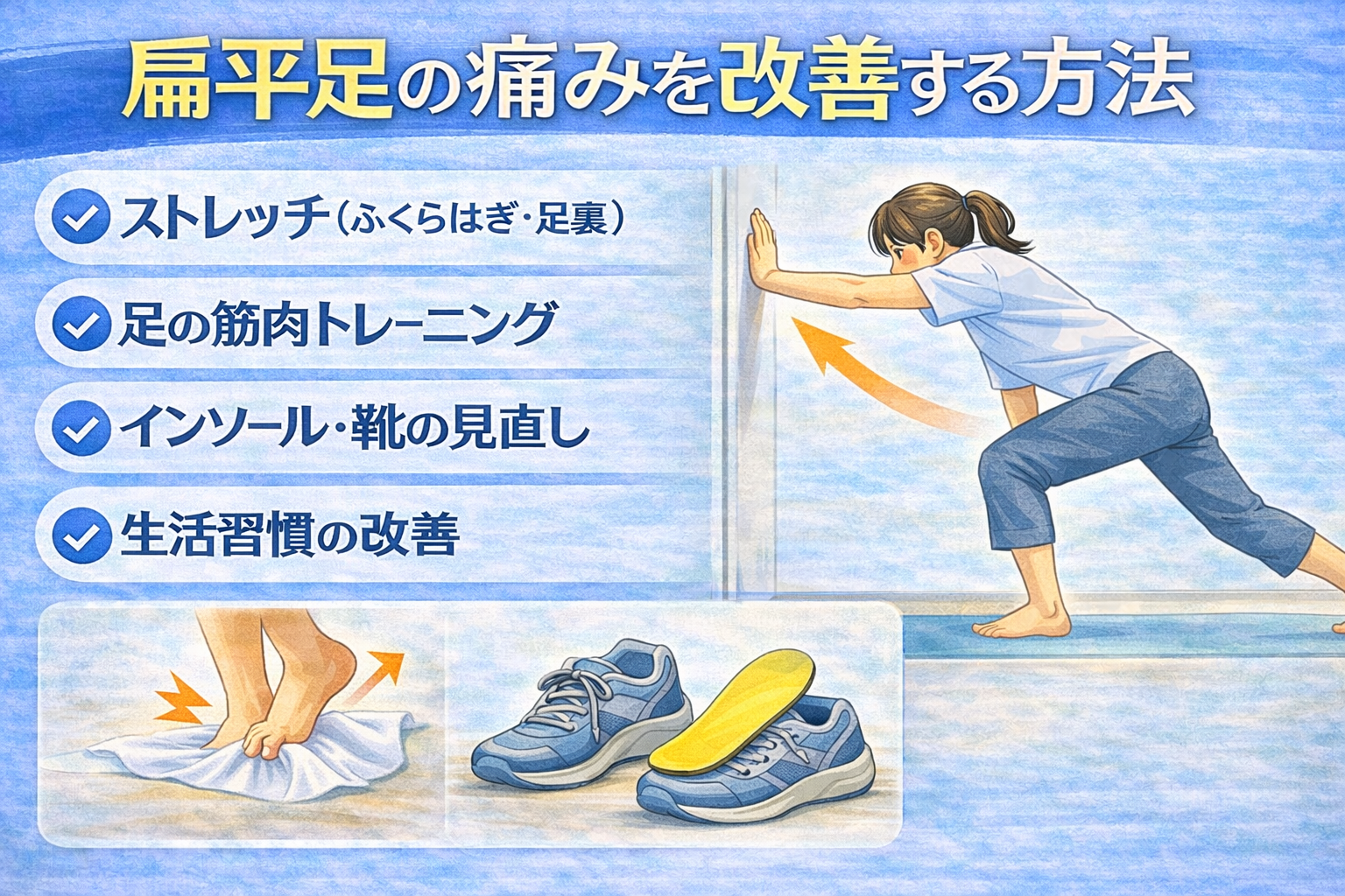 扁平足では、土踏まずを支える筋肉の働きが弱くなっている場合もあると言われています。足指を使った運動やタオルを足でつかむトレーニングなどを行うことで、足の筋肉を使いやすくなる可能性があるとされています。