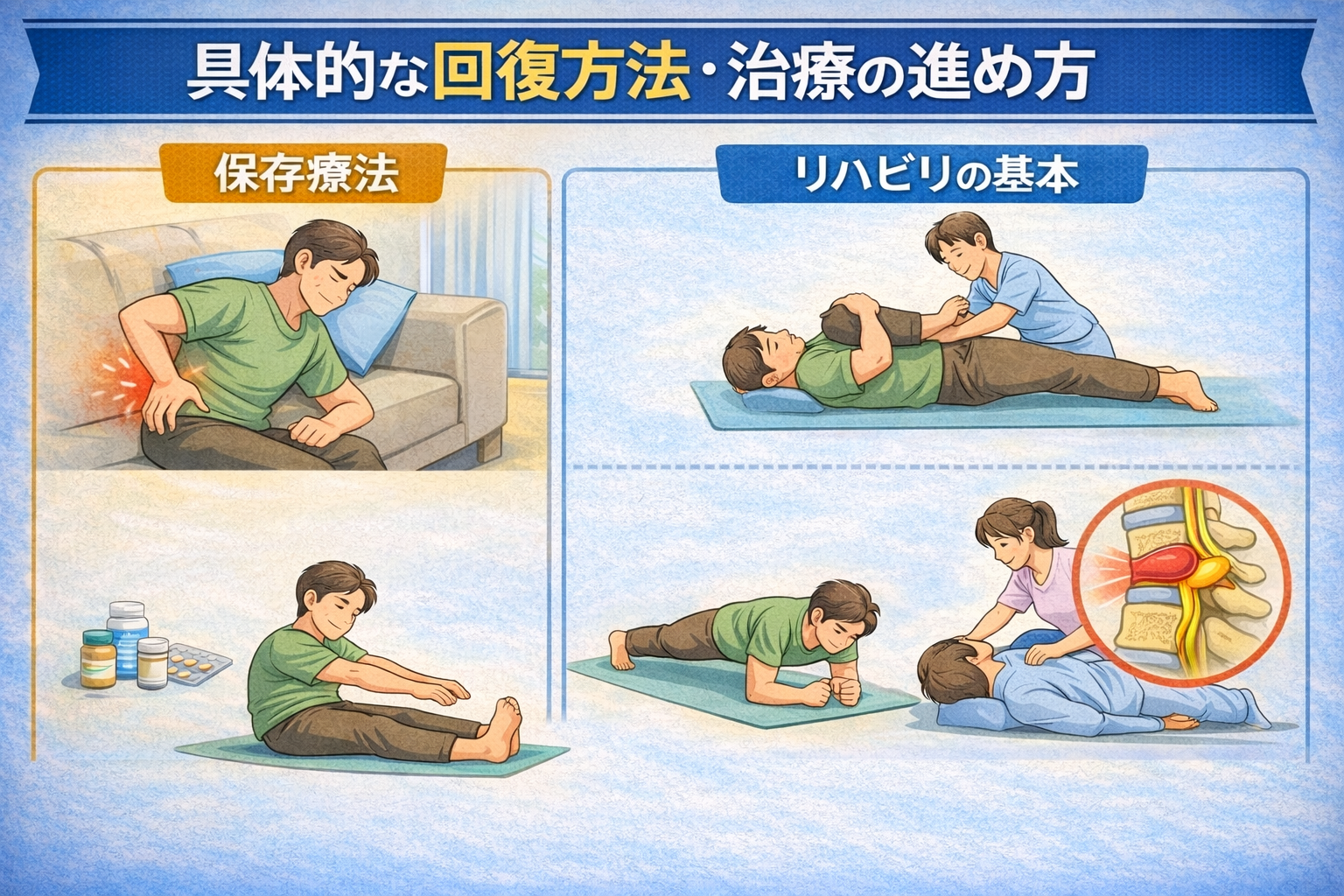 加えて、薬の使用やコルセットの装着によって痛みの負担を和らげる工夫が行われることもあるそうです。さらに、状態が落ち着いてきた段階では、軽い体操を取り入れるケースも紹介されています。