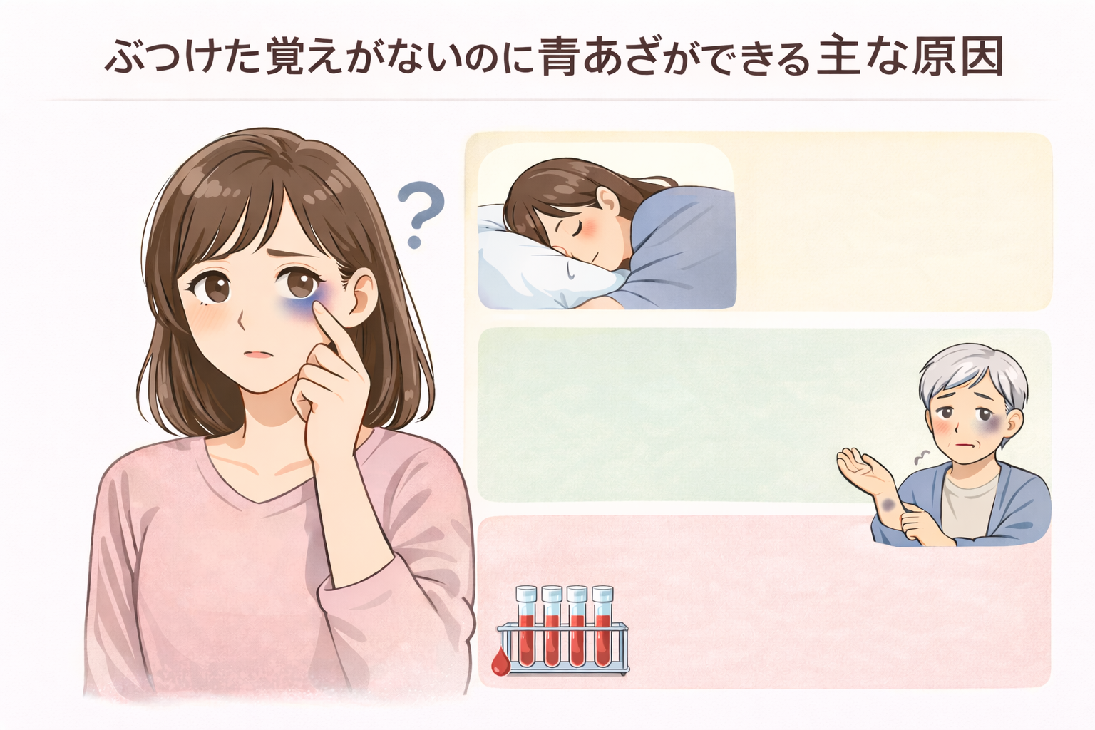 見た目が似ていても原因が異なるケースがあるため、「青あざだと思っていたら別の状態だった」という例もあると言われています。色が長期間変わらない、左右差が大きい、急に広がるなど違和感がある場合は、無理に自己判断せず相談する視点が大切です。