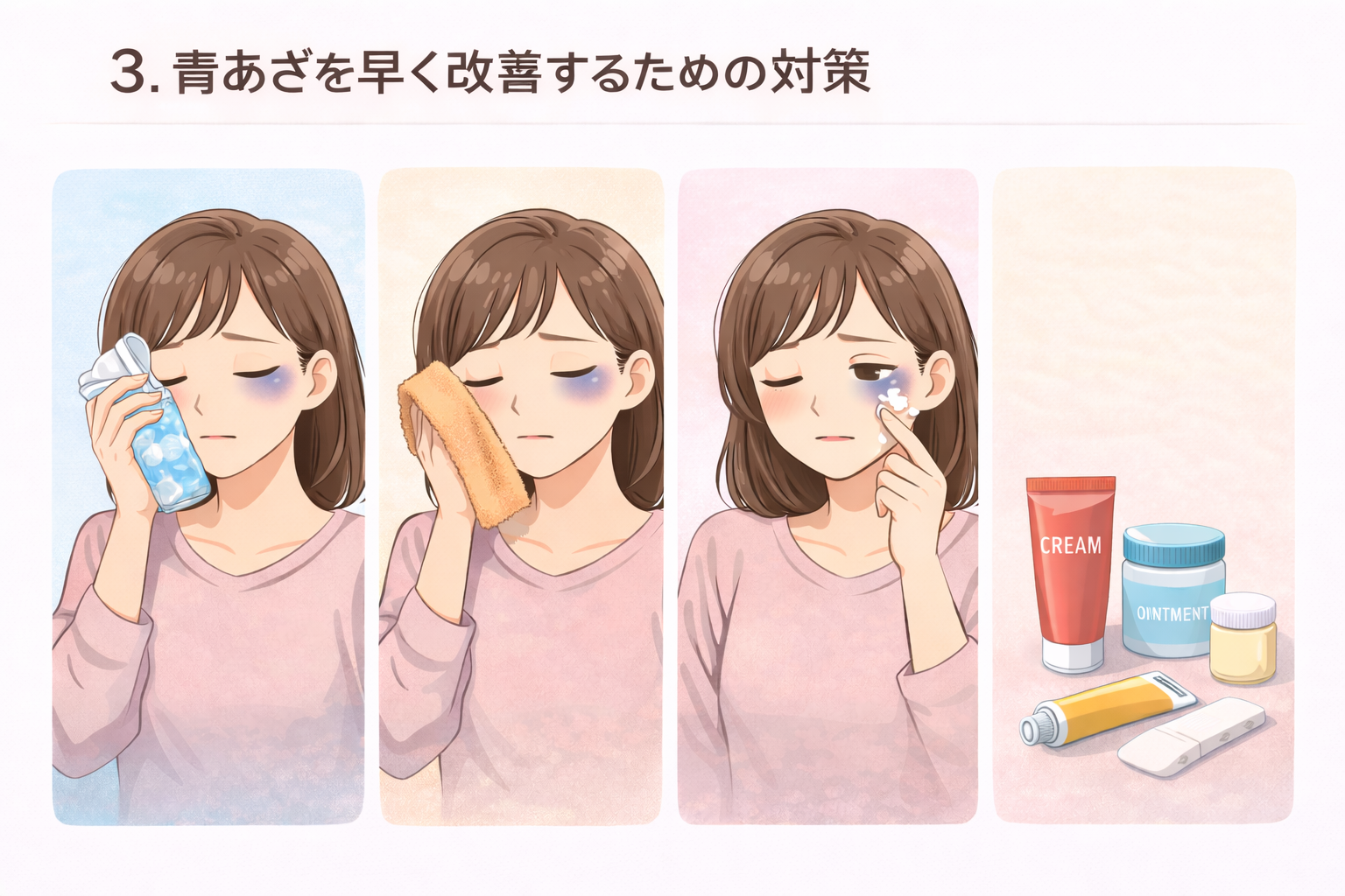 スポーツ外傷などで知られる**R.I.C.E方式(安静・圧迫・冷却)**は、青あざのケアでも考え方として参考になると言われています。無理に触らず、こすらず、刺激を最小限にすることが重要です。