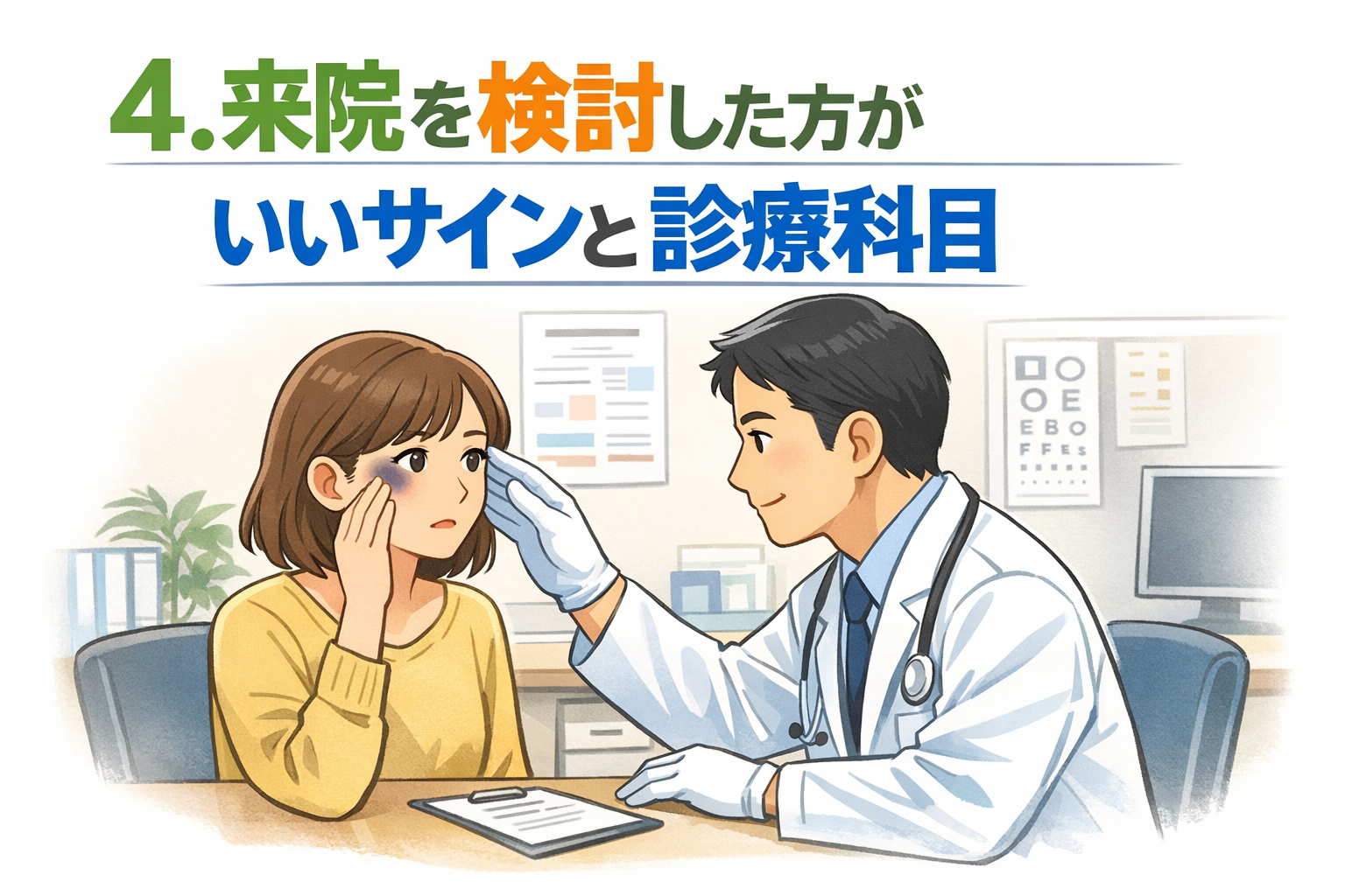 目の下の青あざに加えて、強い痛みや腫れ、視界がぼやけるなどの症状がある場合も注意が必要だと言われています。「見えづらい気がする」「押すと強く痛む」といった違和感が続くときは、自己判断だけで様子を見るより、体の状態を確認してもらう視点が大切です。また、発熱や強いだるさなど全身症状を伴う場合も、早めの相談につながるサインになると考えられています。