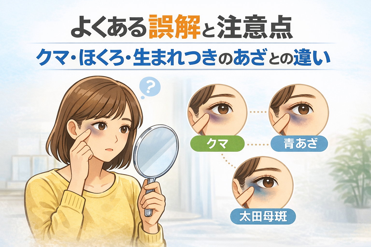 目の周囲に青みがかった色が現れるものの中には、太田母斑など先天的な特徴が関係するケースもあると言われています。これらは幼少期から徐々に現れることが多く、突然できる青あざとは経過が異なると考えられています。