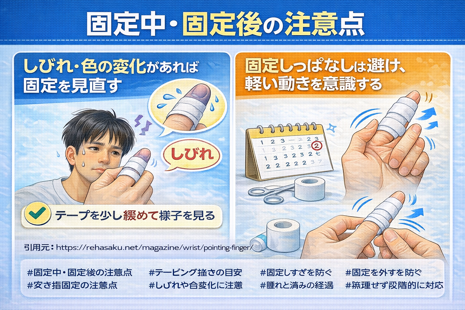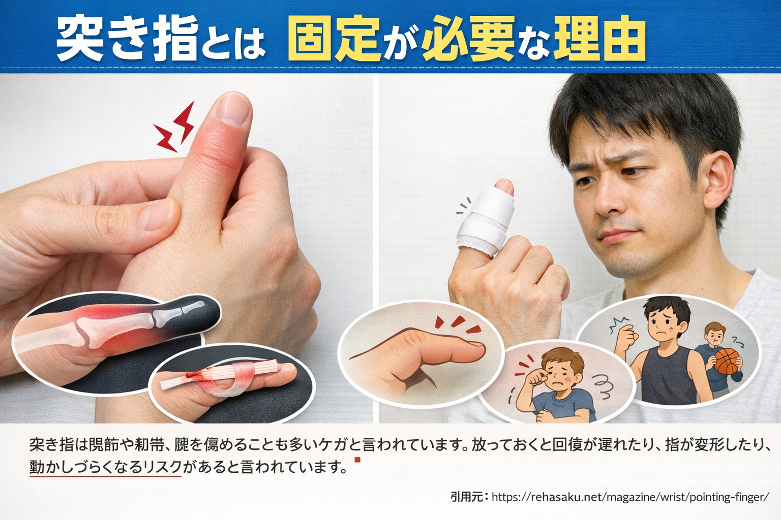 では、なぜ突き指には固定が必要なのでしょうか。「そのまま使い続けるとどうなるの?」と疑問に思いますよね。参考記事では、負担がかかった状態で動かし続けることで、腫れが長引いたり、関節がスムーズに動かしづらくなったりする可能性があると言われています。また、指の変形や可動域制限につながるケースもあるとされており、安静にして固定することが大切だと説明されています。固定は「動かさないための工夫」であり、指を休ませるためのサポート役のような存在と考えるとわかりやすいでしょう。