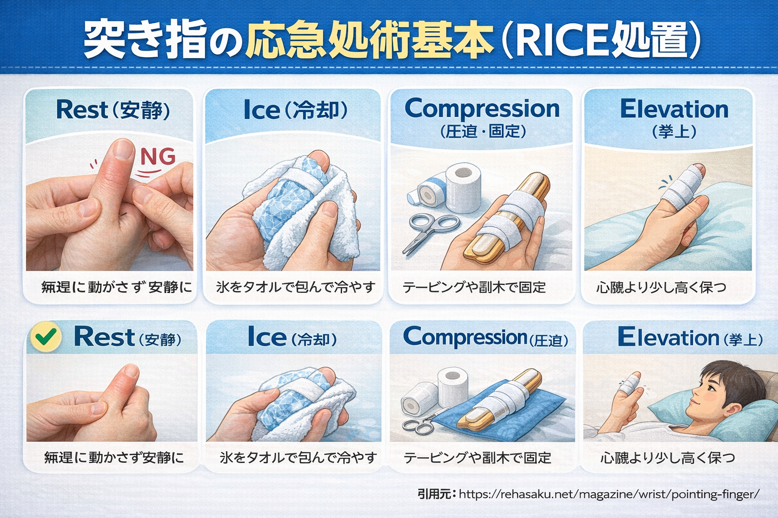 「突き指したけど、少しなら動かしても大丈夫かな?」と思うこと、ありますよね。でも参考記事では、痛めた直後は無理に動かさず、できるだけ安静に保つことが大切だと言われています。引っ張ったり、強く揉んだりすると、関節や靭帯にさらに負担がかかる可能性があるとも紹介されています。まずは「触りすぎない・使いすぎない」を意識することが、応急対応の第一歩だと考えられています。