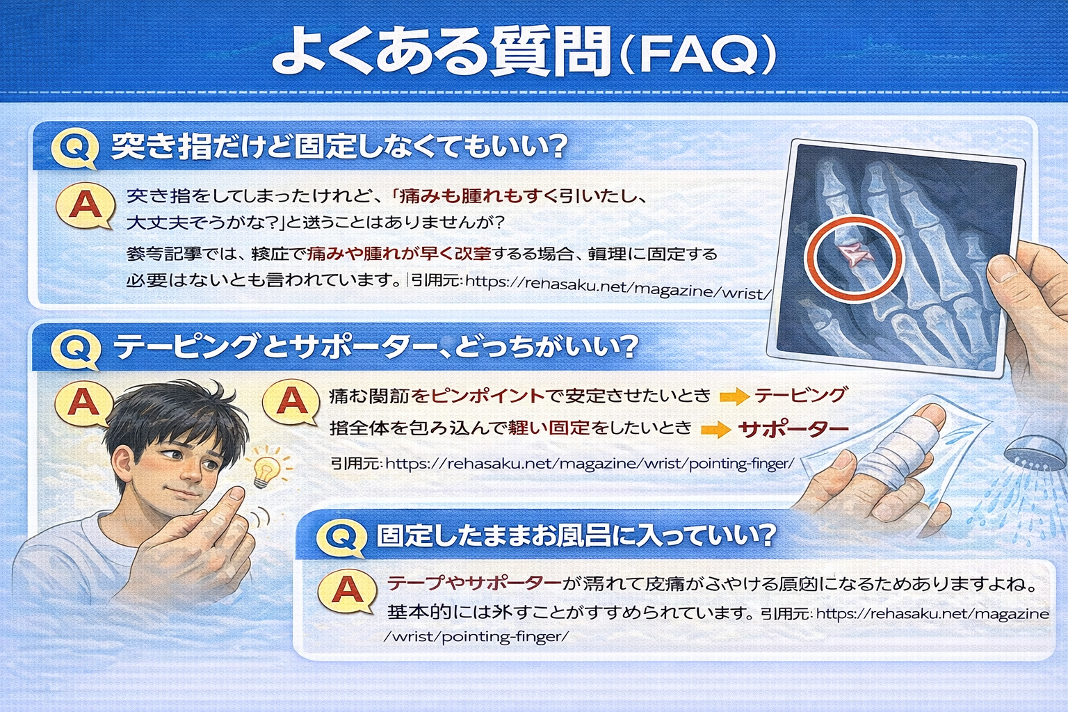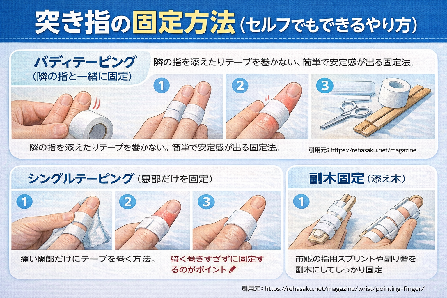 腫れや痛みが強く、「テープだけでは心もとない」と感じる場合には、副木固定が有効なケースもあると言われています。市販の指用スプリントや、割り箸などを指の両側に当てて固定し、テープや包帯で留める方法です。参考記事では、しっかり固定することで指の動きを抑えやすくなり、負担を軽減しやすいと説明されています。ただし、圧迫が強すぎると違和感につながる可能性があるため、様子を見ながら調整することが大切だと紹介されています。