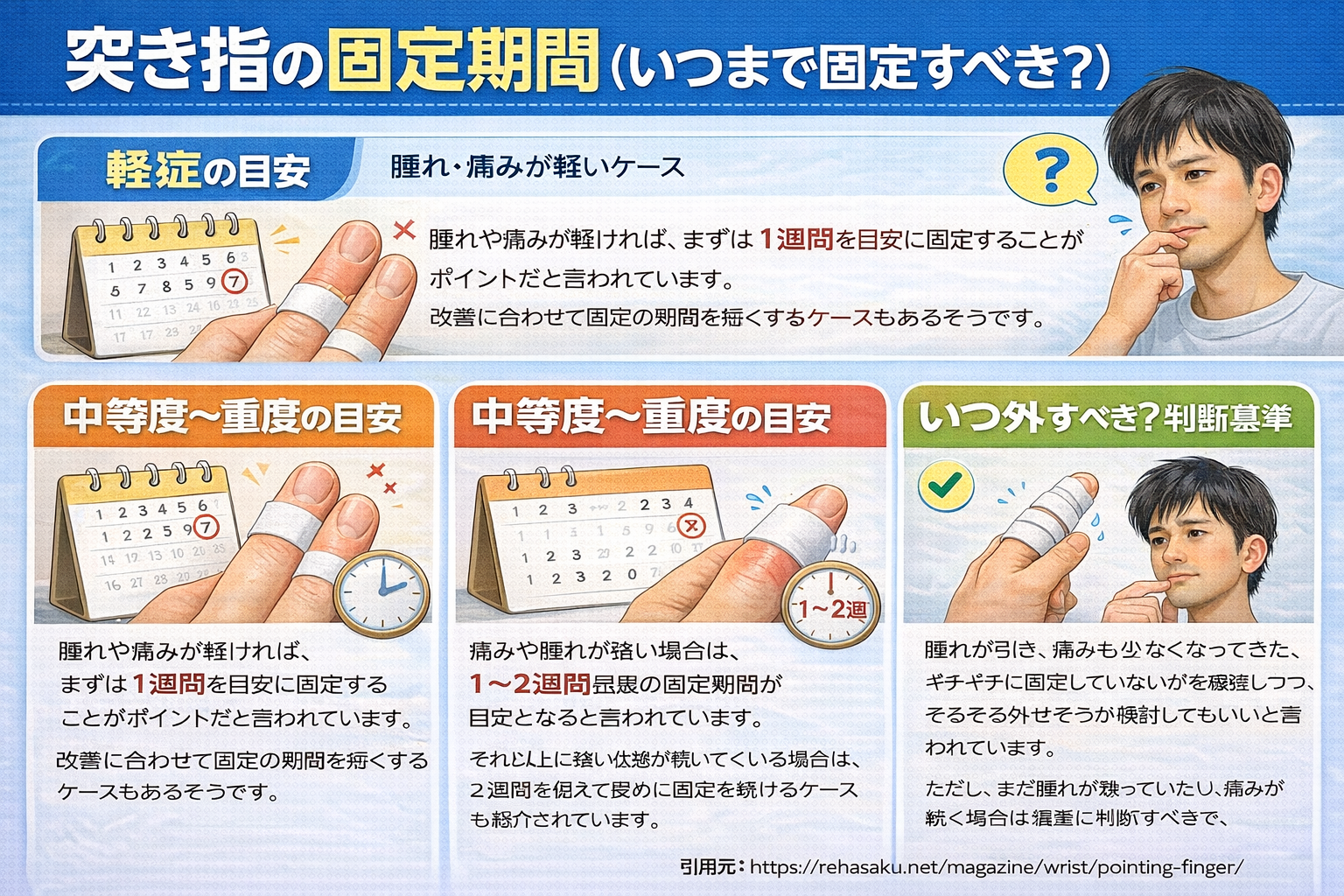 一方で、「腫れが強い」「ズキズキした痛みが続く」といったケースでは、固定期間はもう少し長めになると言われています。参考ページでは、こうした状態の場合、1〜2週間程度の固定が目安になることがあると記載されています。さらに症状が強い場合には、それ以上の期間、固定を継続するケースもあるとも紹介されています。痛みの出方や指の動かしやすさには個人差があるため、「他の人より長くかかっている」と感じても、焦らず経過を見ることが重要だと考えられています。