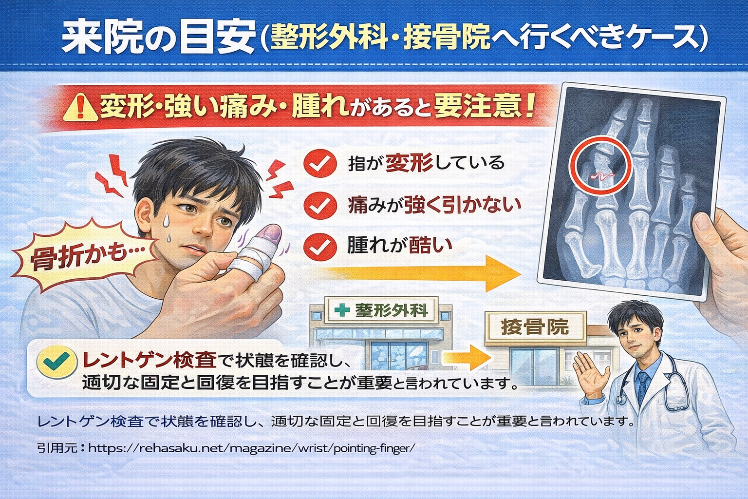 「突き指だと思って様子を見ていたけど、指の形が少しおかしい気がする…」「数日たってもズキズキしてつらい」そんなときは、不安になりますよね。参考記事では、明らかな変形がある場合や、痛みがなかなか引かない場合、腫れが強い状態が続く場合には、軽い突き指だけでなく重症の可能性も考えられると言われています。見た目が普段と違う、触れると強い痛みがある、指をほとんど動かせないといったサインは、来院を検討する一つの目安になると紹介されています。