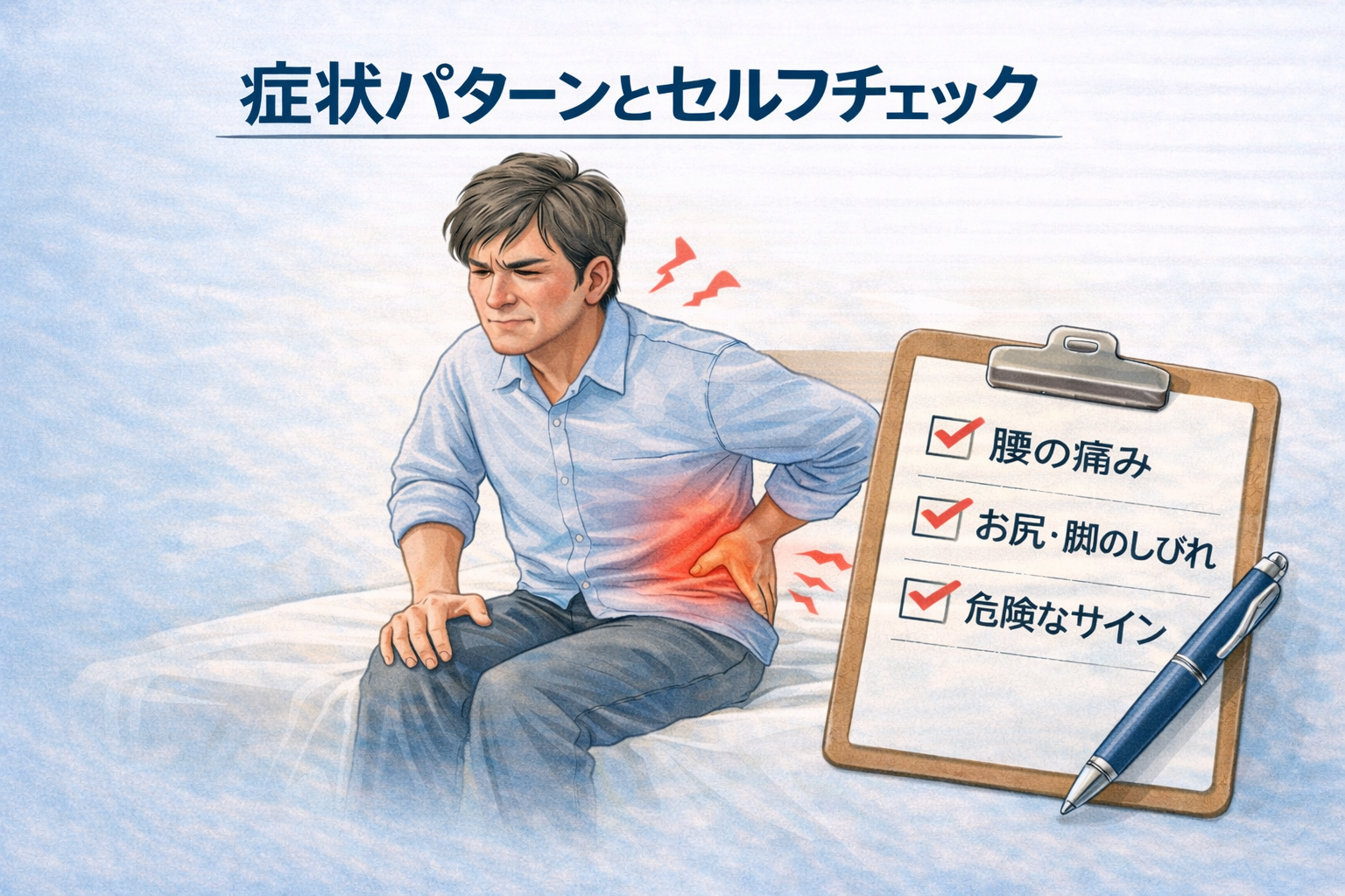 後者の場合、神経への刺激が関係している可能性があると言われています。「腰だけだと思っていたのに、脚まで変な感じがする…」という声も見られます。こうした広がり方は、セルフチェックのひとつの目安になるとも言われています。