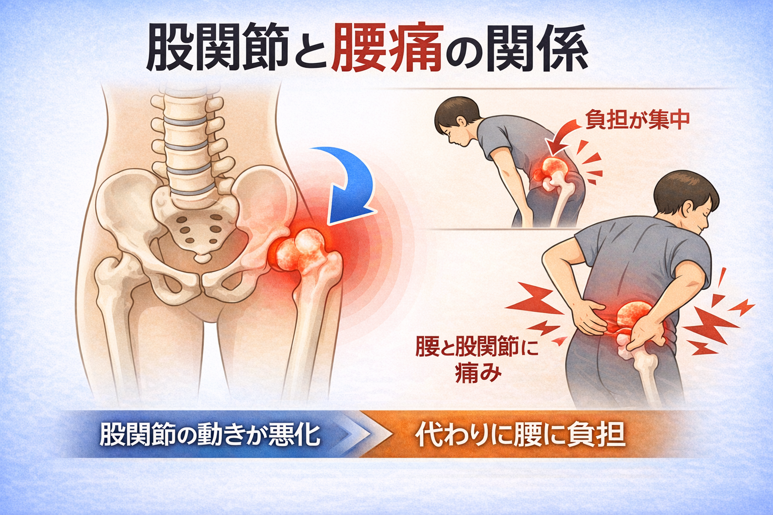 「股関節が痛いだけでは?」と思う方もいますが、股関節の動きが制限されると体のバランスが変わり、腰に負担が集まりやすくなることがあると考えられています。その結果、腰痛を同時に感じるケースもあると言われています。