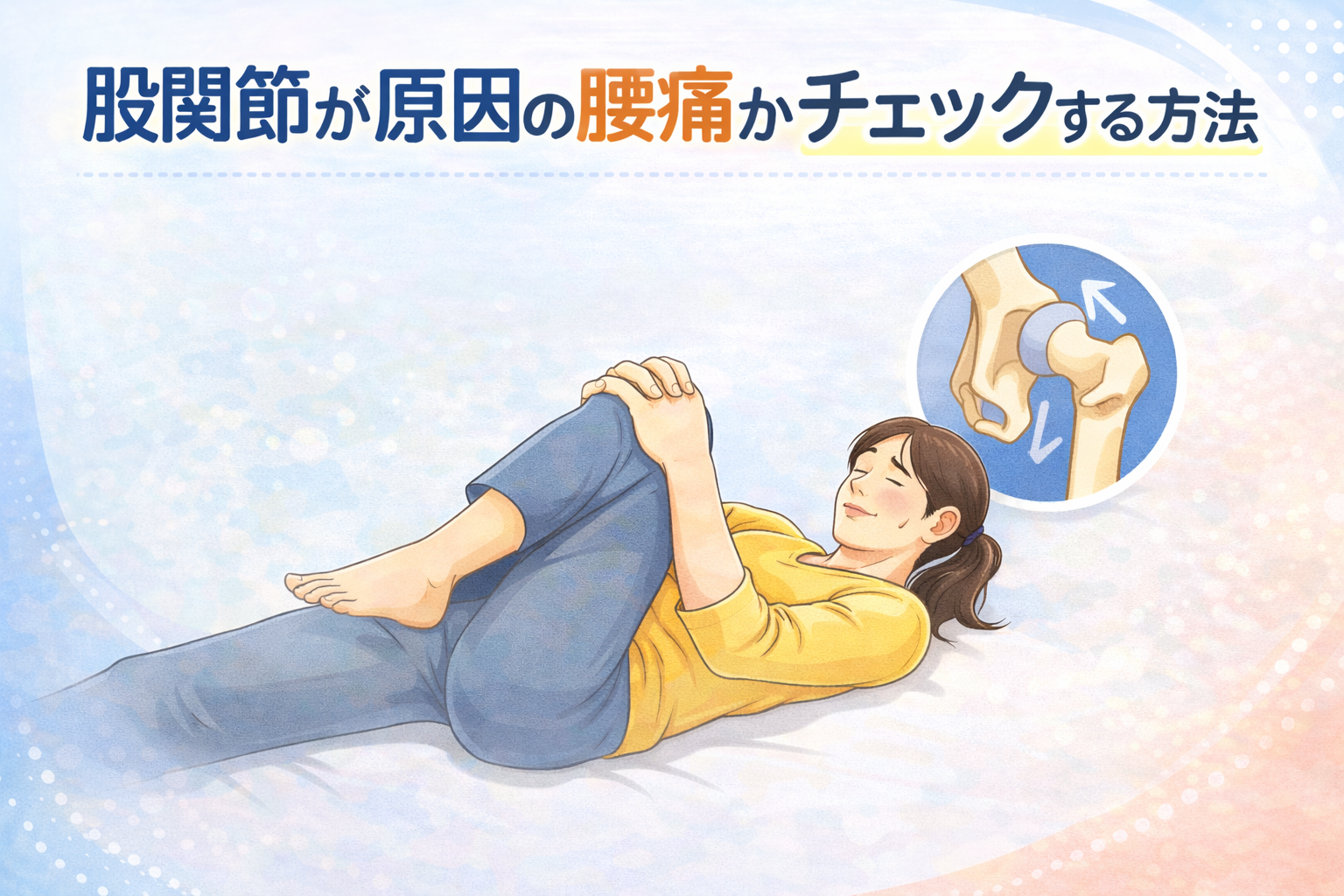 たとえば、仰向けになって片膝を胸に近づける動作をしてみてください。このとき股関節の付け根に痛みや違和感が出る場合、股関節の影響が関係している可能性があると言われています。