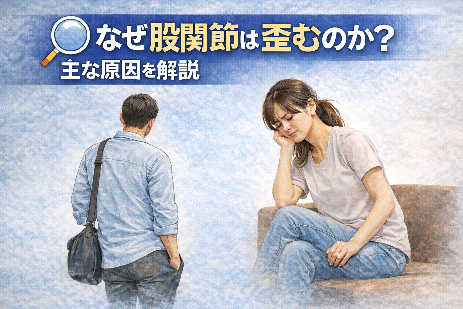股関節の歪みとは、骨が大きくずれるというより、骨盤の傾きや筋肉バランスの崩れによって、関節の動きに偏りが出ている状態を指すことが多いようです。片足重心や脚を組む習慣などが影響する場合もあると言われています。
