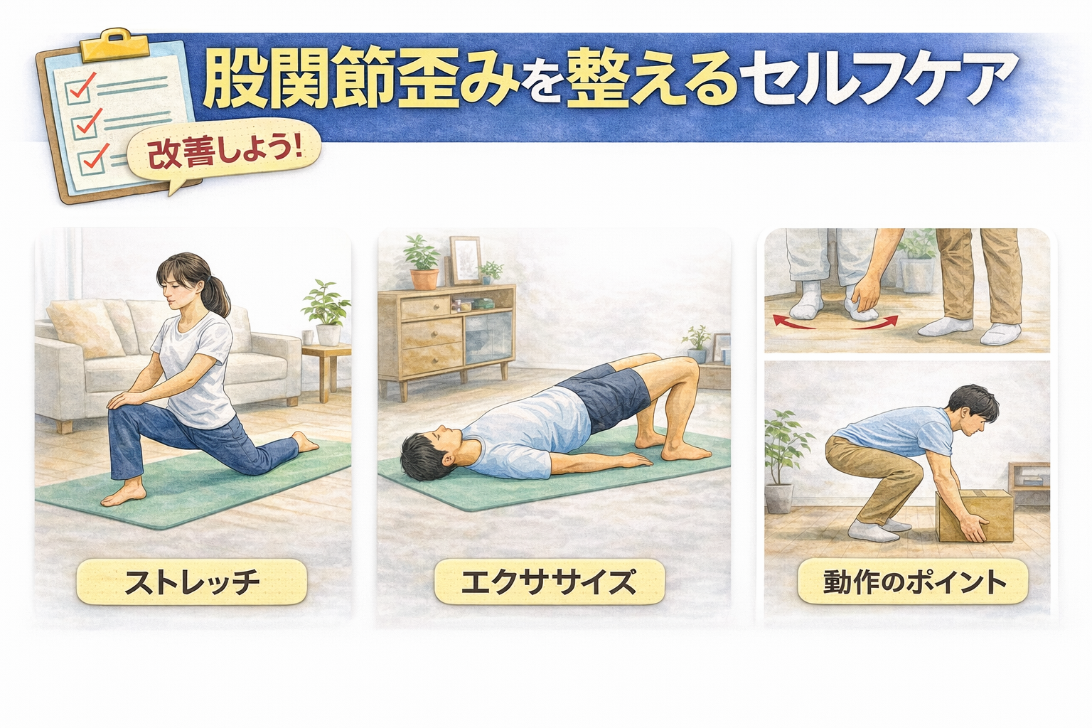股関節 歪み を整えるセルフケア(ストレッチ&エクササイズ)