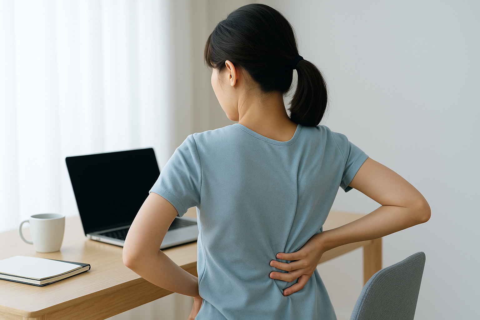 椅子の奥まで座り、腰のカーブに小さなクッションを当てると、背骨の自然なS字を保ちやすくなります。