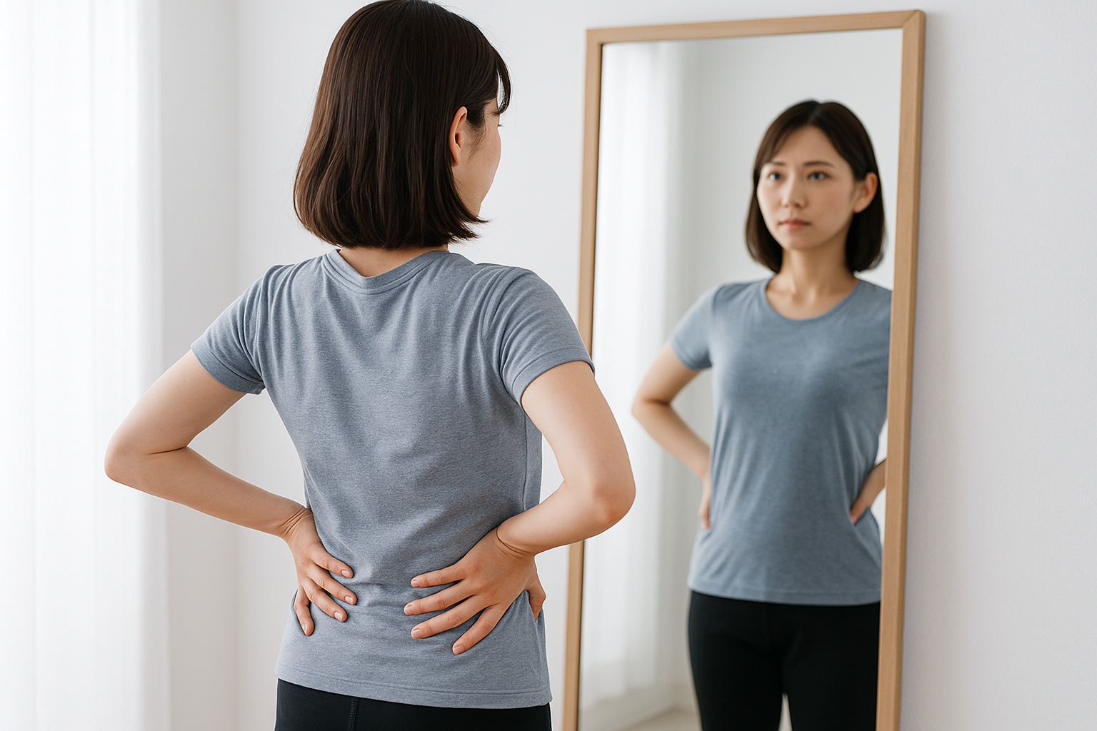 次に姿勢のクセを確認しましょう。壁に背をつけたとき、後頭部・肩甲骨・お尻の3点が自然に壁に当たりますか?