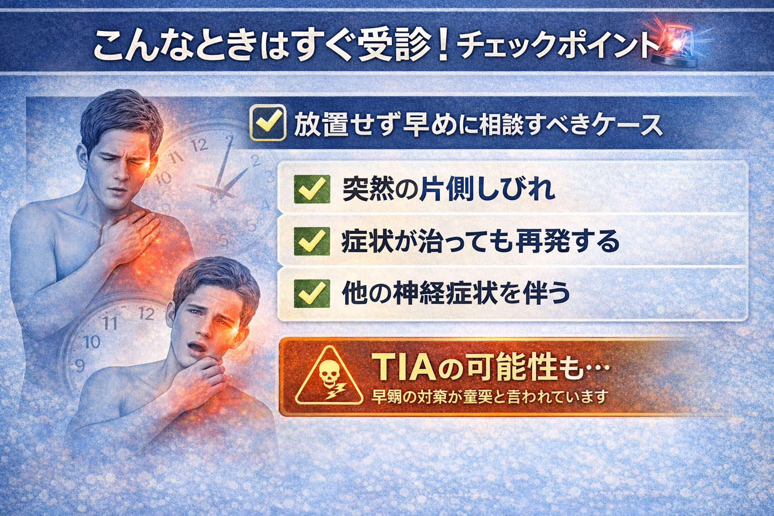 これらの症状が一時的に出て消える場合、「一過性脳虚血発作(TIA)」の可能性もあると言われています。TIAは短時間で違和感が改善することもあるものの、「将来的な脳梗塞の前触れになることがある」と指摘されています。