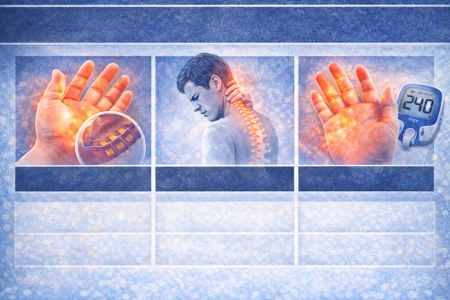 さらに糖尿病性神経障害では、左右両方の指先がじわじわとしびれてくるパターンが多いとされています。時間帯に関係なく続く違和感として現れることもあるようです。