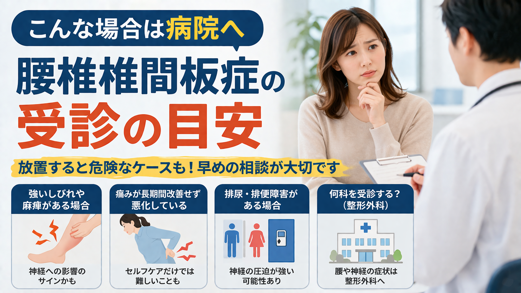 「このまま様子見で大丈夫かな…?」と迷いますよね。腰椎椎間板症は時間をかけて改善していくこともありますが、中には放置すると悪化につながる可能性があると言われています。特に神経に関わる症状や、日常生活に支障が出ている場合は注意が必要とされています。