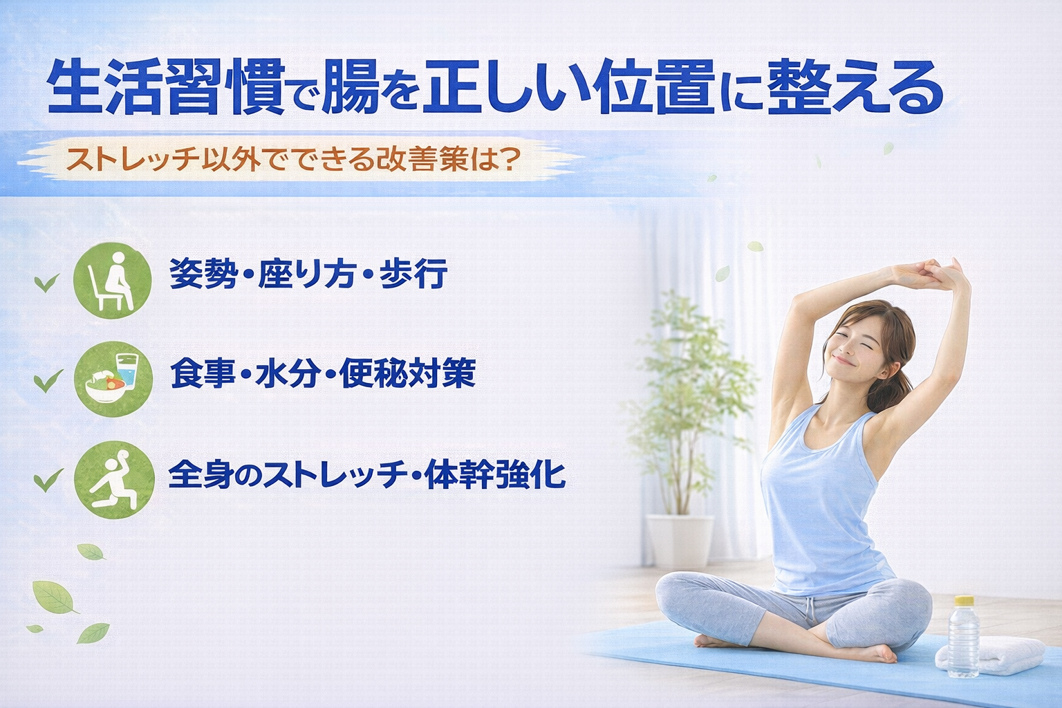 腸は筋肉や腹圧に支えられており、姿勢や体のクセの影響を受けやすいそうです。そこで、ストレッチによって体幹や骨盤まわりが動きやすくなると、腸が本来の位置に収まりやすい環境が整う可能性があると紹介されています。