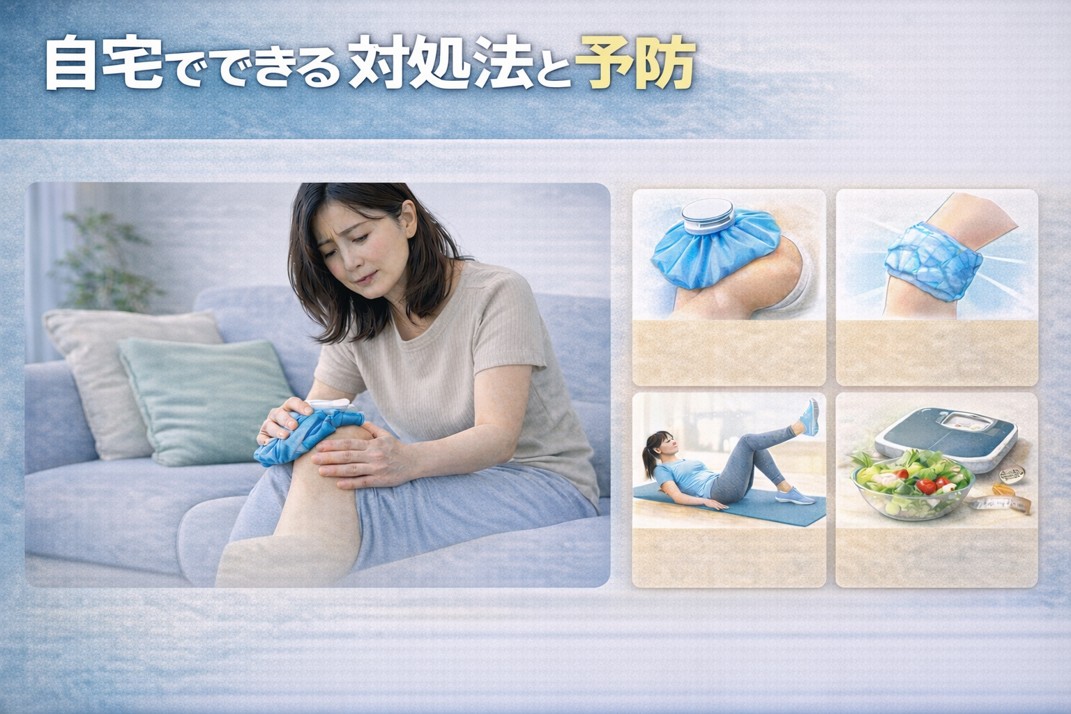 違和感が出ているときは、「少し休ませる」ことが基本になると言われています。長時間歩いた日や階段の上り下りが多かった日は、膝まわりを冷やして様子を見る人も多いようです。
