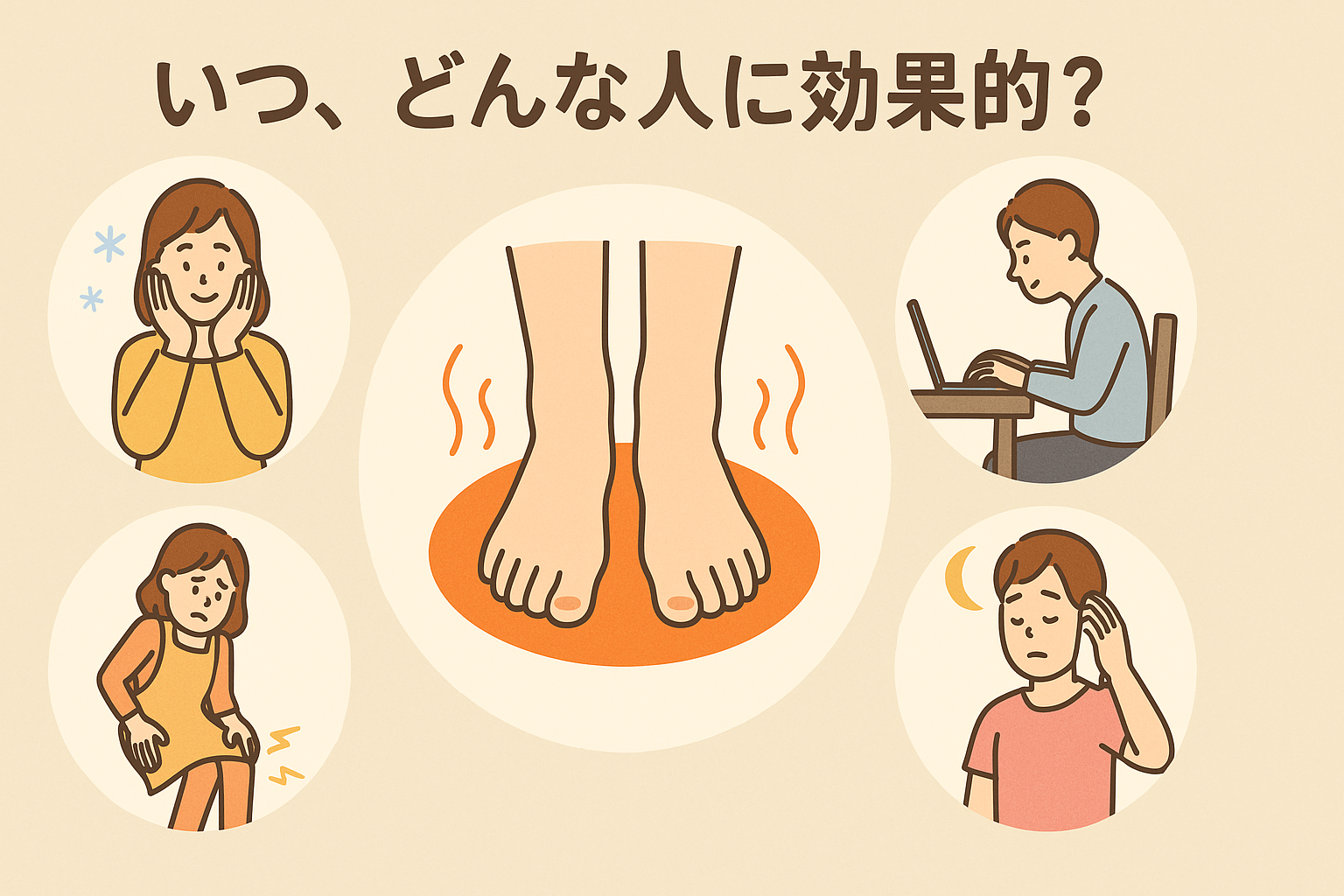 また、立ち仕事の方も足のだるさやむくみが強く出やすく、「帰宅後に足裏を温めると楽になる気がする」という声があります。さらに、寝つきの悪さを感じている人からも「温めると布団に入りやすい」と話されることがあり、リラックス目的で取り入れるケースも多いです。