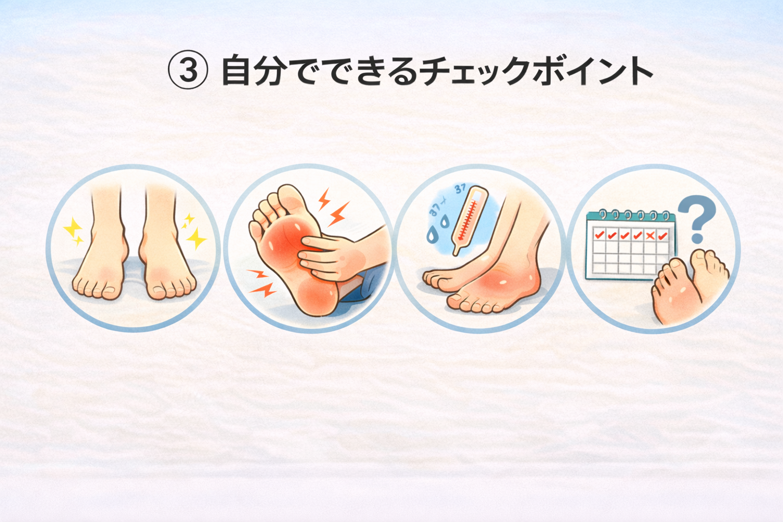 足の裏が腫れて痛いとき、今の状態を整理するだけでも不安はかなり軽くなると言われています。ここでは、自宅でできるチェックポイントを順番に見ていきましょう。