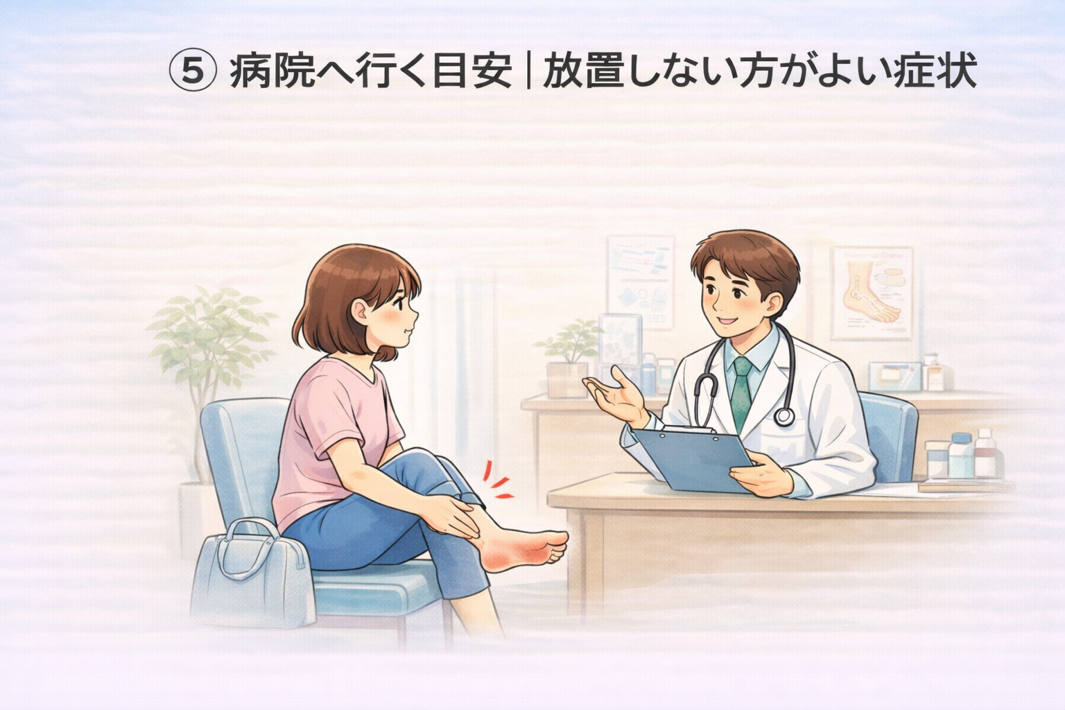足の裏の腫れや痛みが続くと、そんな不安がよぎりますよね。ここでは、**不安を煽らずに“来院を考える目安”**を整理します。