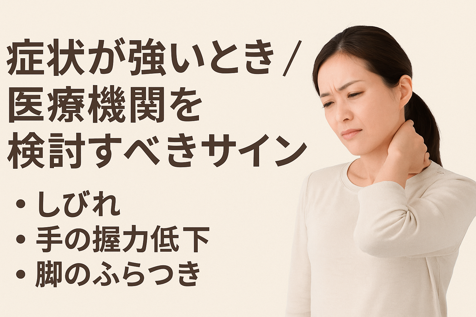 また、「手がしびれやすい」「腕の重だるさが強い」といった神経のサインがある場合は、いきなり負荷をかけると刺激になりやすいと言われています。まずは落ち着いて動かせるかどうかを確認してみてください。