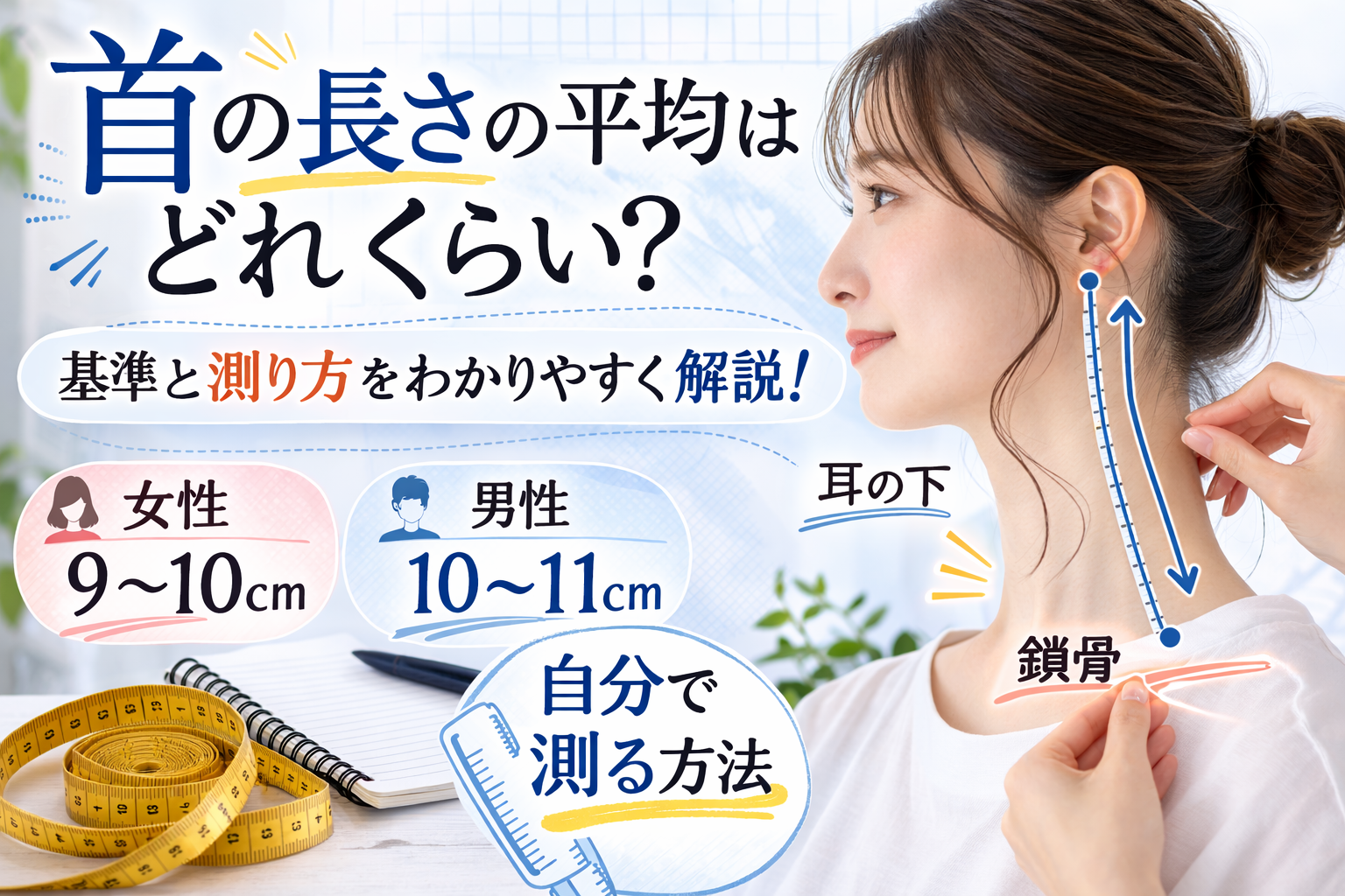 一般的に、日本人の首の長さは女性で約9〜10cm、男性では約10〜11cm程度が目安になると言われています。ただし、この数値はあくまで平均的な目安であり、身長や肩幅、顔の大きさなどによって見え方は変わることがあります。首の長さは体全体のバランスとも関係すると言われているため、平均より短くても必ずしも問題があるわけではないとされています。