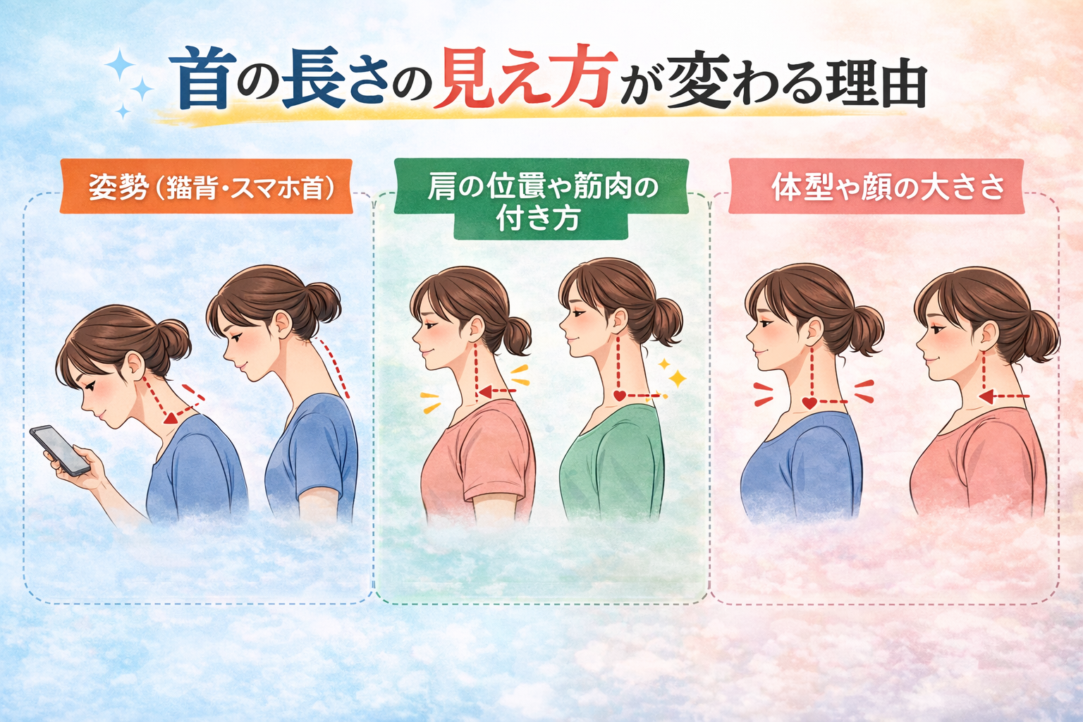 たとえば、猫背の姿勢になると肩が前に出てしまい、首が詰まって短く見えることがあります。逆に背筋が伸びて肩の位置が整うと、同じ首の長さでもすっきり長く見えることがあるようです。このように、首の長さの印象は体全体のバランスとも関係していると言われています。引用元:【⭐︎参考記事】https://seitai-osusume-select.com/column/%e9%a6%96%e3%81%ae%e9%95%b7%e3%81%95%e3%81%a8%e3%81%af%ef%bc%9f%e5%9f%ba%e6%ba%96%e3%83%bb%e8%a6%8b%e3%81%88%e6%96%b9%e3%81%ae%e9%81%95%e3%81%84%e3%83%bb%e7%9f%ad%e3%81%84-%e9%95%b7%e3%81%84%e3%81%ae/