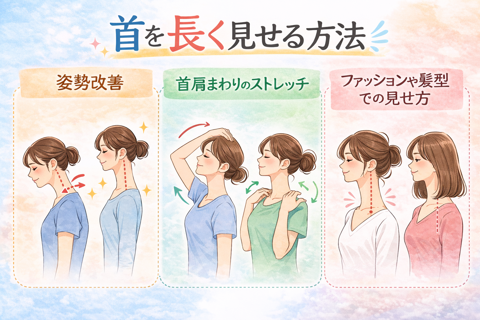 たとえば猫背の姿勢では肩が前に出て首のスペースが狭く見え、首が短く見えることがあります。逆に姿勢が整うと首から肩のラインがすっきりし、首が長く見えることがあると言われています。また、ストレッチで肩まわりを動かしたり、髪型や服装を工夫したりすることで、首の見え方が変わることもあると考えられています。
