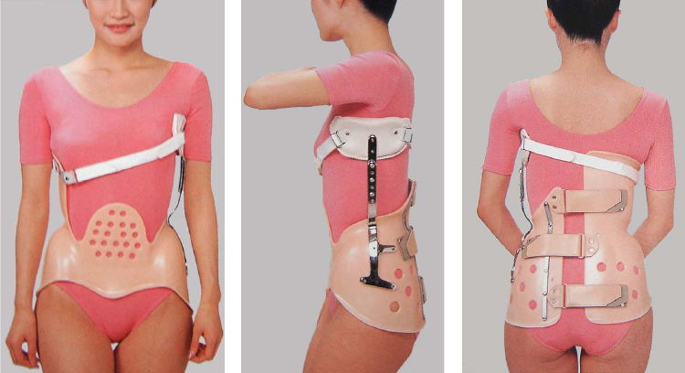 一般的に、背骨の曲がりが20度から45度くらいの中等度の側湾症では、症状が進まないように装具(コルセットなど)を使った改善方法があります。